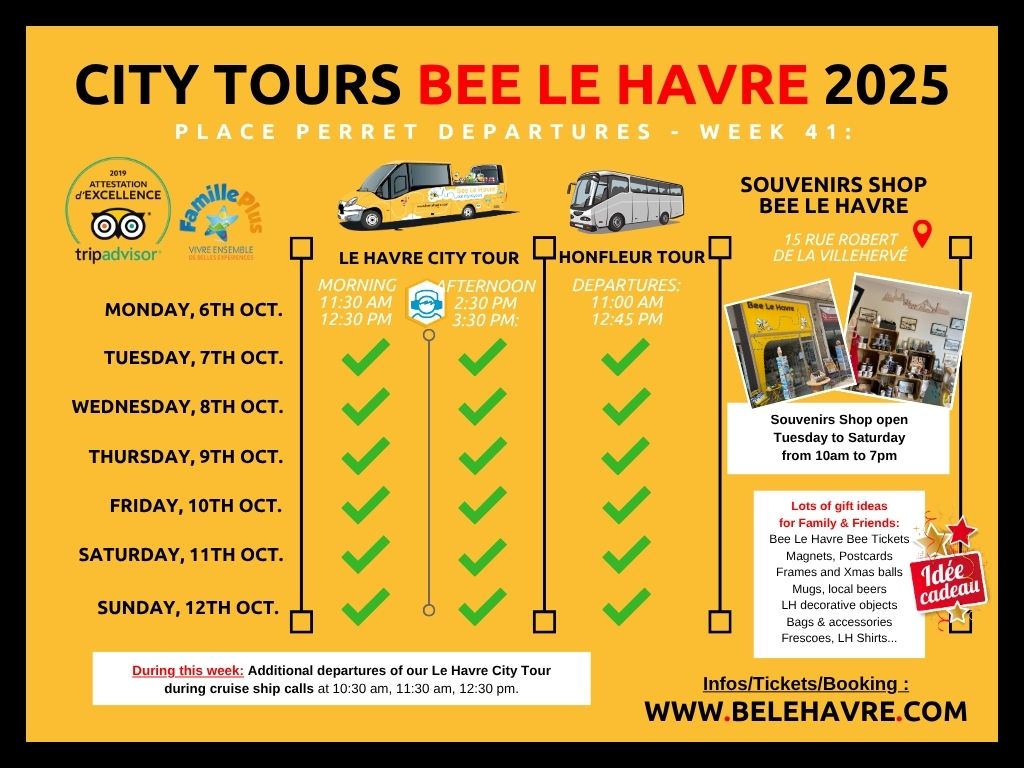 Nachstehend finden Sie die Abfahrtszeiten von unserer Bushaltestelle (Place Perret) für unsere Panorama-Audioführung mit dem Bus Bee Le Havre City Tour und unsere anderen atypischen Touren zwischen Le Havre, Honfleur und der Normandie:     Wichtiger Hinweis! Während der Touristensaison findet unsere mehrsprachige Stadtführung durch Le Havre Bee Le Havre City Tour jeden Nachmittag statt….